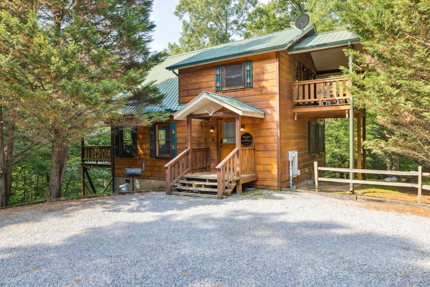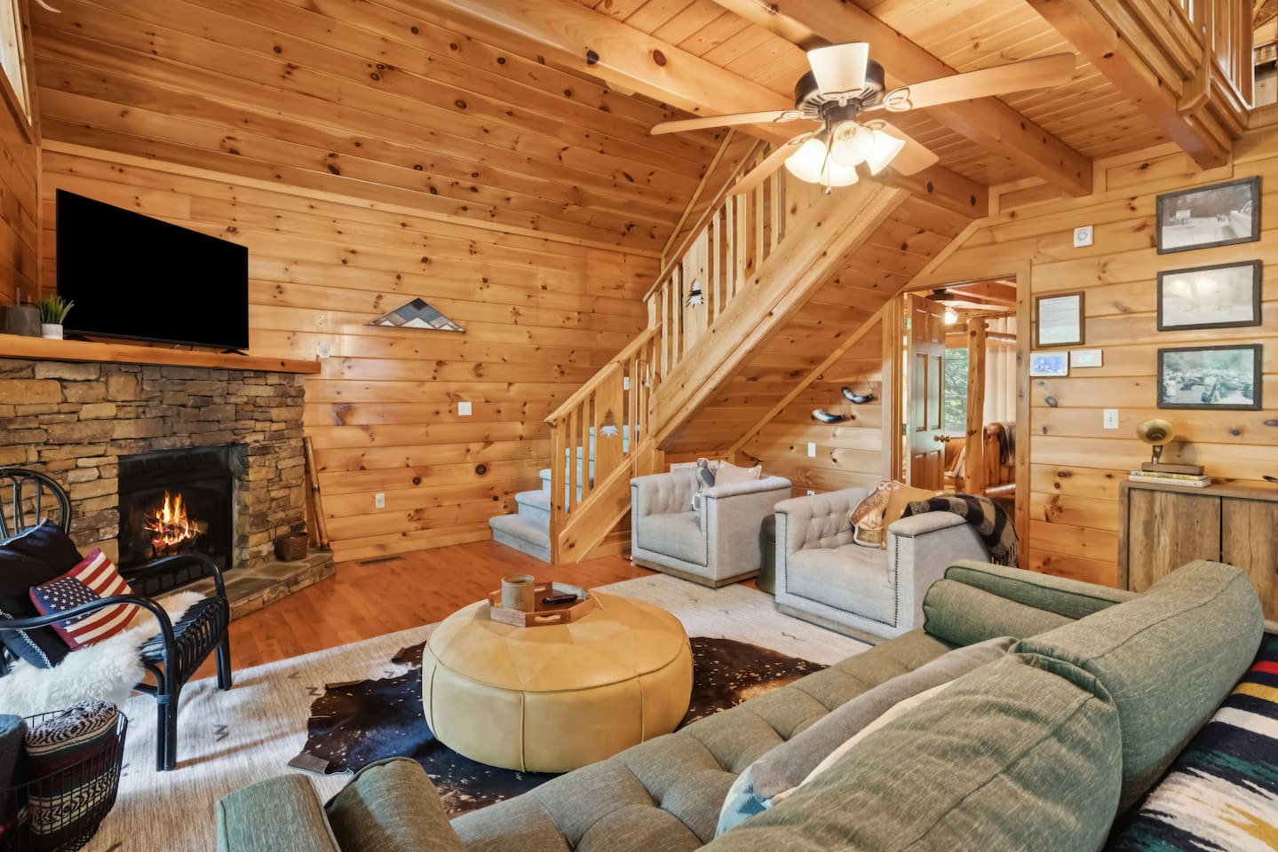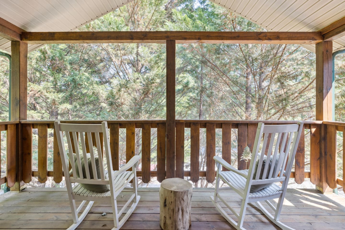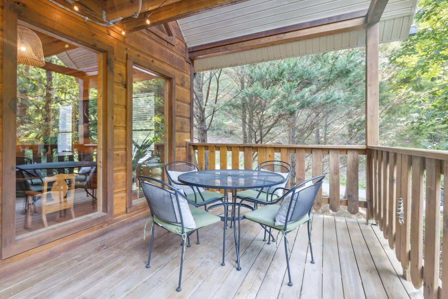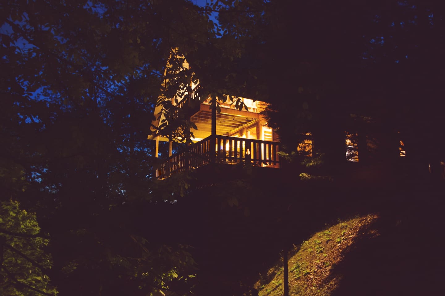 Our area is typically very quiet. You may hear echoes from other cabins in the ridge. The cabin is on one acre filled with trees. There is one cabin across the street from the front of the cabin and a few others down on our road, but the setup of our cabin makes it feel extremely private once you are inside. There are no cabins directly facing the back porches and they are many acres away.