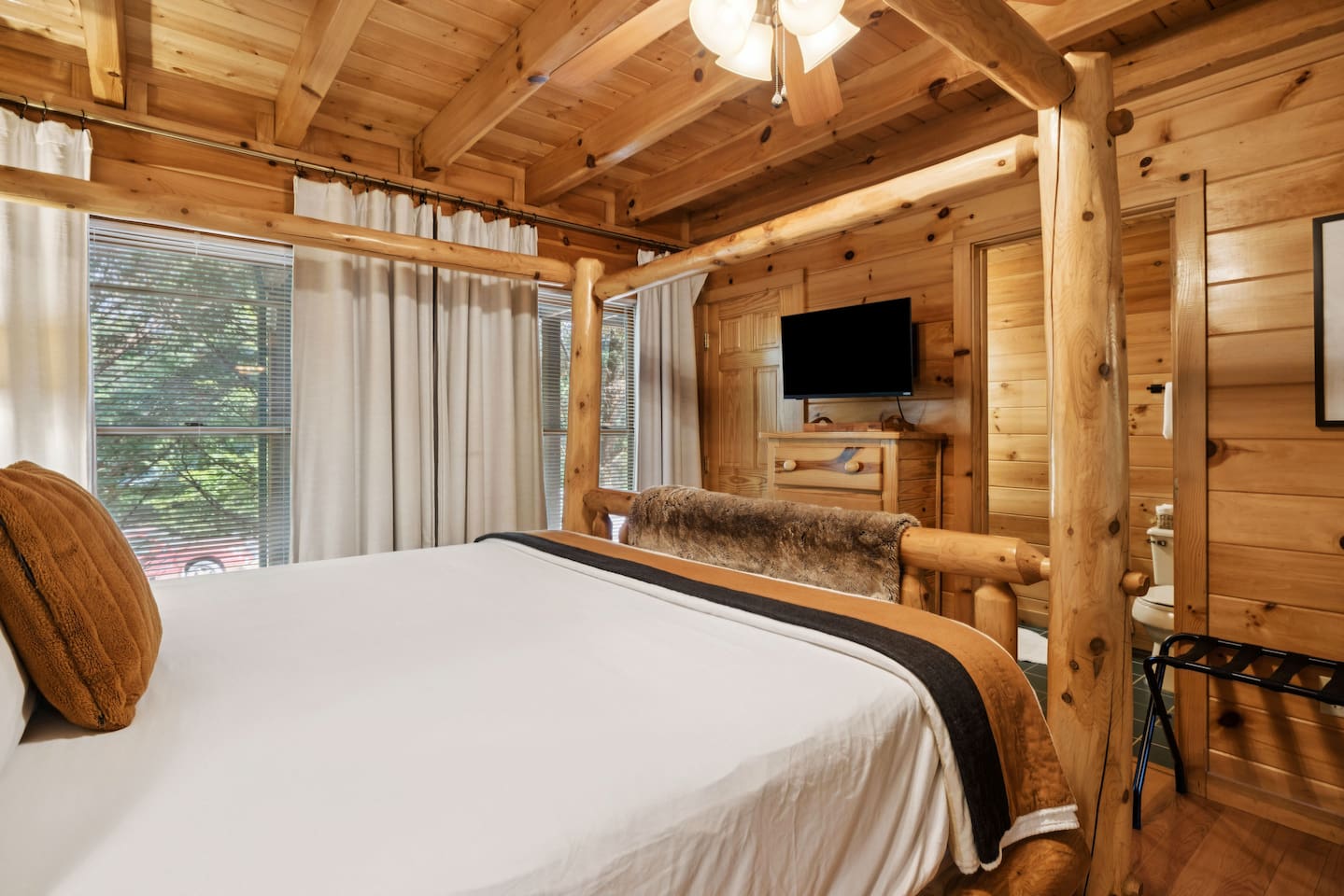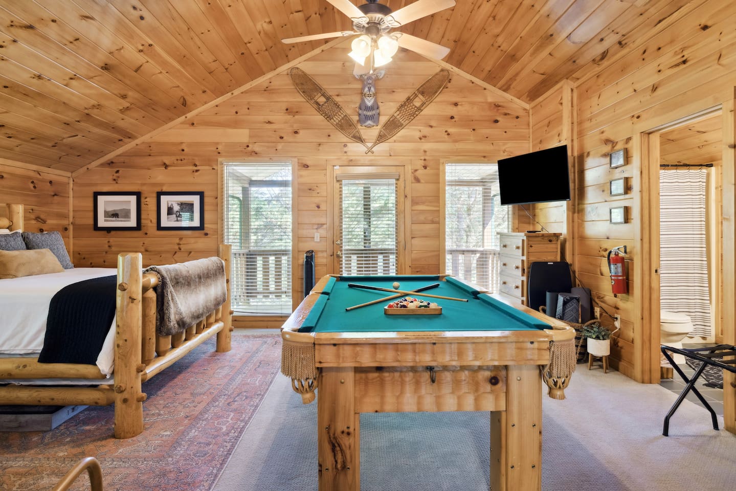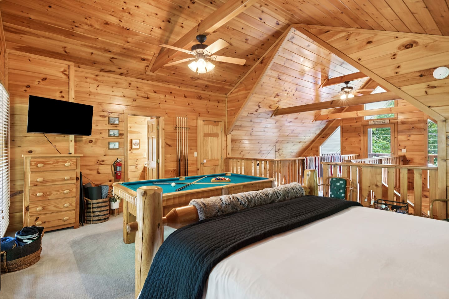 MOUNTAIN VIEW â˘There is no mountain view, but the secluded feeling of being in the tree tops makes up for it! ROADS â˘The roads are somewhat narrow and a few parts are steep/on an incline. They can also be dark at night. However, if you want to stay in the mountains you will have to navigate this with almost any property you book. Trust us, you will be a pro after you have driven the roads once! We encourage a four-wheel drive vehicle in the winter months due to the chance of snow. If it does snow, please be aware that the roads can freeze and the county isn't the best at clearing or salting the side roads. It's the South so it happens infrequently and they wait for it to melt. MASTER BEDROOM â˘The log king bed is very large & takes up most of the space in the master bedroom. The blackout curtains make it a perfect sleeping den though! WIFI â˘We have fiber internet now! Woo hoo! CELL SERVICE â˘Cell phone signal can be a bit spotty at times but typically works okay. It just may be a bit slow for browsing on your phone or video chatting if you're not using WIFI. LOFT â˘The loft sleeping and pool table area has no door. It is an open space. The bathroom up there does have a door though.
